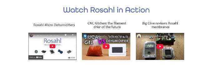Rosahl uses a solid polymer electrolyte membrane to transport moisture out of a sealed enclosure. When powered, water molecules are moved through the membrane and released externally as vapour.